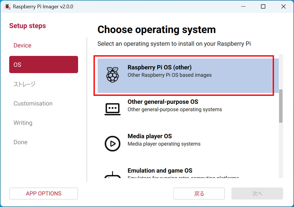 使用するバージョンが決まったら、Imagerで選択します。一覧に無いものは「Raspberry Pi OS (other)」から選択可能です。