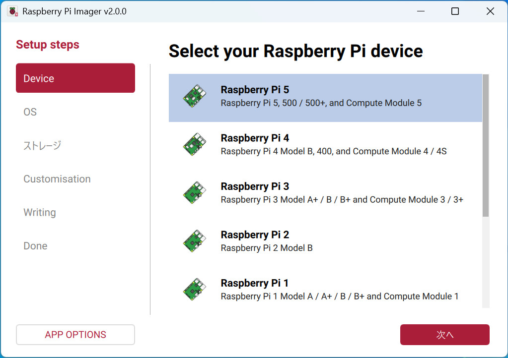 Imagerを起動すると、以下のような画面が表示されます。まず「Device」で使う予定のRaspberry Piの種類を選ぶと、推奨OSを絞ってくれます。選択したら「次へ」をクリックします。