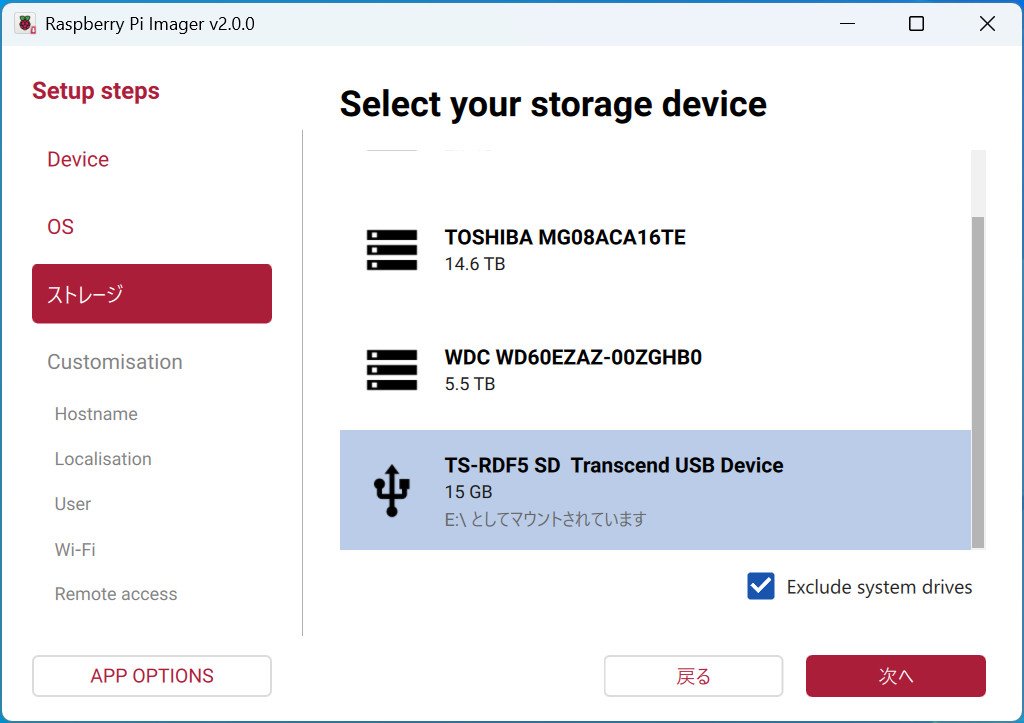 「ストレージ」で書き込み先を指定します。デバイス名や容量を参考に目的のmicroSDカードを選択して、「次へ」をクリックします。書き込み先のmicroSDカードは消去されますので、間違えないように注意して下さい。余計な外付けストレージなどはあらかじめ外しておくと良いと思います。
