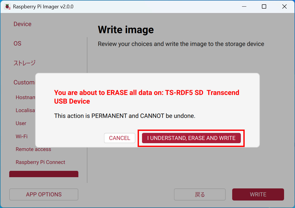 書き込み前の確認が表示されます。指定したmicroSDの内容は消去されるほか、誤った書き込み先を指定してしまうとそちらも消去されてしまいます。よく確認してから「I UNDERSTAND, ERASE AND WRITE」をクリックします。