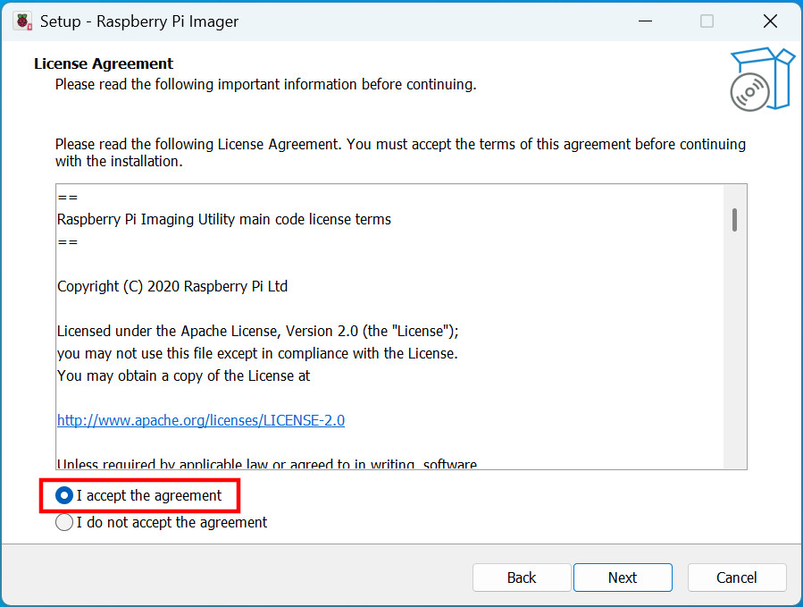 途中ライセンス確認が表示されたら「accept」をチェックして「Next」をクリックします。
